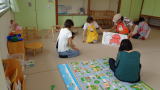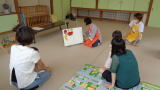 「中央図書館読み聞かせボランティアの会」のおはなしのへやが行われました。いつもはプレイルームとして遊べる部屋で、大きな絵本やパネルシアターが行われました。興味があるときには立ち上がったり、お話ししたり、みんなで楽しい時間を過ごしました。 |